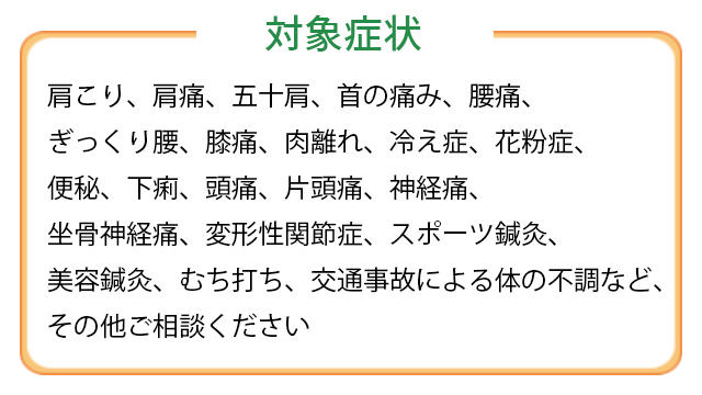 理論:中国伝統医学(中医学)の理論を基して治療します。すなわち、局部の治療だけではなく、全身の状態を脈や四診(望、聞、問、切)によって、把握して、局部か全身かをそれぞれ中心に治療することが出来る方法です。